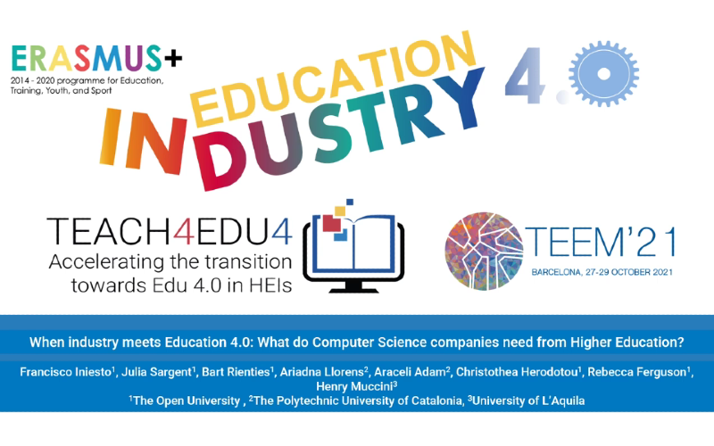As part of the TEEM21 Barcelona track 7 Engineering Education: new challenges, new approaches, on October 27th 2021 the paper titled “When industry meets Education 4.0: What do Computer Science companies need from Higher Education?”, was presented. The authors are partners on the TEACH4EDU4 project: Francisco Iniesto, Julia Sargent, Bart Rienties, Christothea Herodotou, Rebecca Ferguson (Open University UK), Ariadna Llorens, Aracelli Adam (The Polytechic University of Catalonia), Henry Muccini (University of L’Aquila); the article is directly connected with the projects topic. The recording of the given presentation is available here: https://www.youtube.com/watch?v=FN4kzmR1Gfc&ab_channel=Nat%C3%A9rciaLima